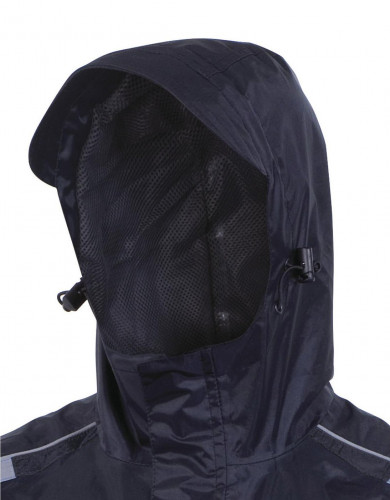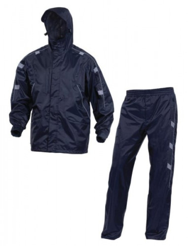 Ensemble de pluie veste et pantalon. Coutures étanchées. VESTE : capuche fixe. Fermeture par zip anti-froid sous rabat agrippant. Bas ajustable par cordon élastique. 5 poches. PANTALON : taille élastique. Bas ajustables par pressions. 2 poches.
