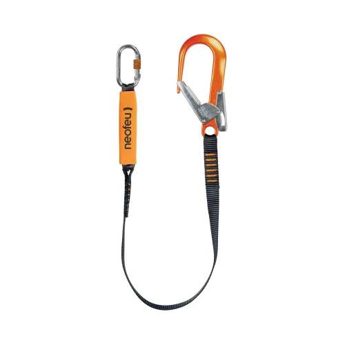 Absorbeur d’énergie avec longe sangle simple intégrée. Un connecteur amovible est positionné côté absorbeur d’énergie et un connecteur amovible ou inamovible côté longe.