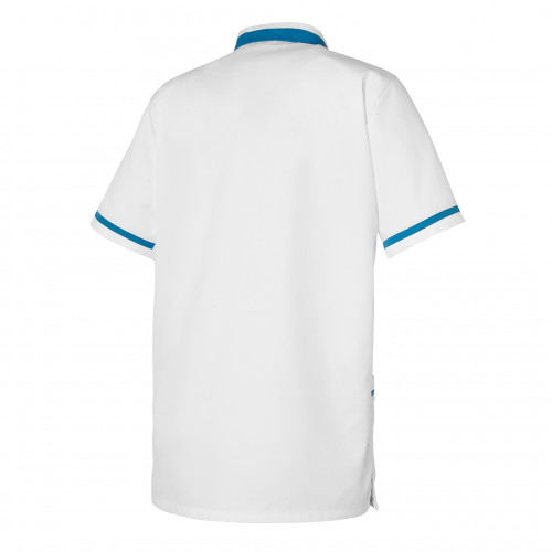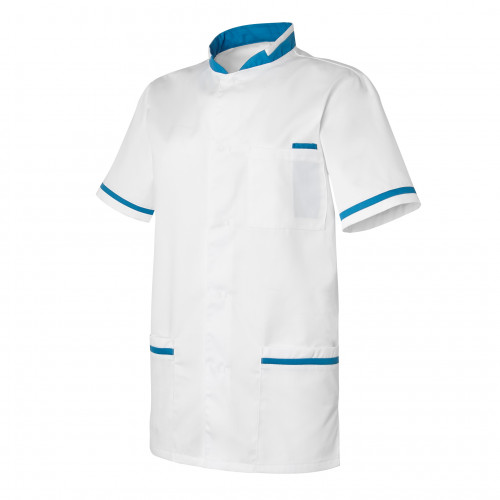 Une tunique pensée pour les hommes : le modèle ANGE bicolore avec son col officier et son colori bleu hôpital répond aux attentes des professionnels exerçant dans le secteur des soins à la personne.