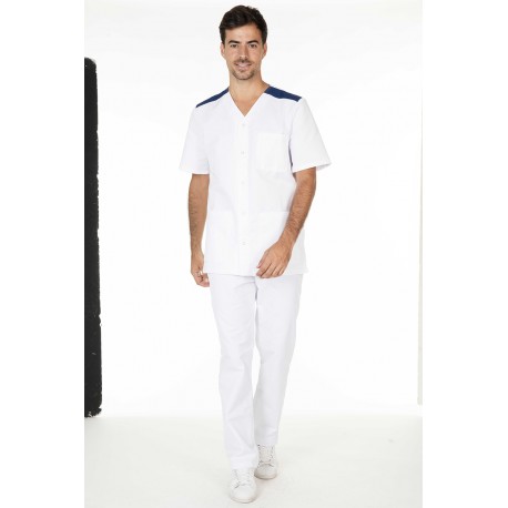 Une tunique homme manches courtes avec une encolure en V et des empiècements au niveau des épaules. Pratique avec ses deux poches basses et sa poche poitrine, le modèle joue la sobriété et l'efficacité.